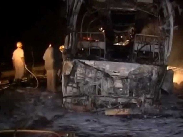 بس میں آگ لگنے کے نتیجے میں 20 سے زائد افراد زخمی ہوئے جن میں دلہا اوردلہن بھی شامل ہیں، زخمیوں کو قریبی اسپتال منتقل کردیا گیا ہے جہاں اسپتال انتطامیہ کا کہنا ہے کہ ان میں سے متعدد کی حالت تشویشناک ہے۔