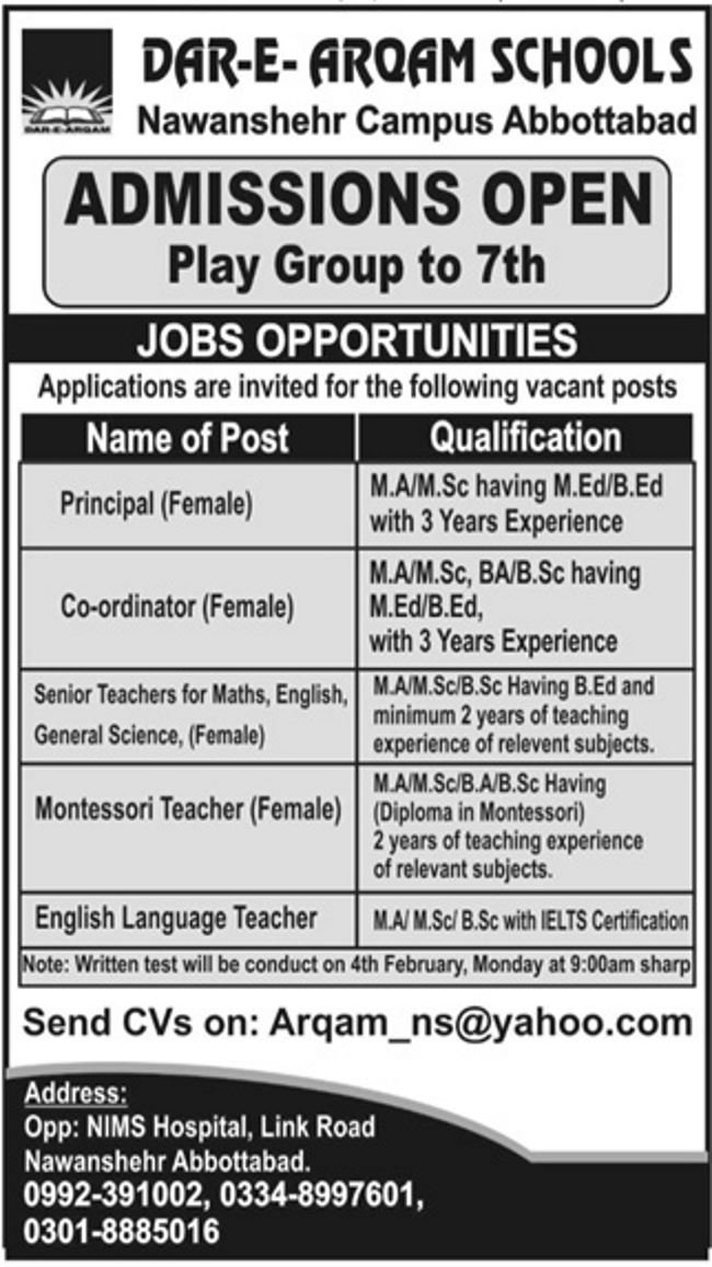 Dar-e-Arqam Schools Abbottabad Jobs 2019 for Teachers, Coordinator and Principal Posts31 January, 2019 Post Views - پوسٹ کو دیکھا گیا: 150