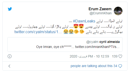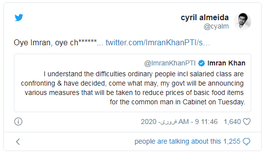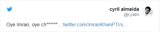 وزیر اعظم عمران خان کے اسی ٹویٹ کو ری ٹویٹ کرتے ہوئے ڈان لیکن سے مشہور ہونے والے صحافی سرل المیڈا نے کہا کہ ’’ اوئے عمران، اوئے چ۔۔۔‘‘۔