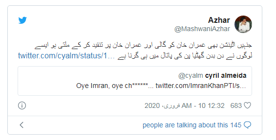 اظہر مشوانی نامی صارف نے کہا کہ ’’ جنہیں اٹینشن بھی عمران خان کو گالی اور عمران خان پر تنقید کر کے ملتی ہو ایسے لوگوں نے دن بدن گھٹیا پن کی پاتال میں ہی گرنا ہے‘‘۔