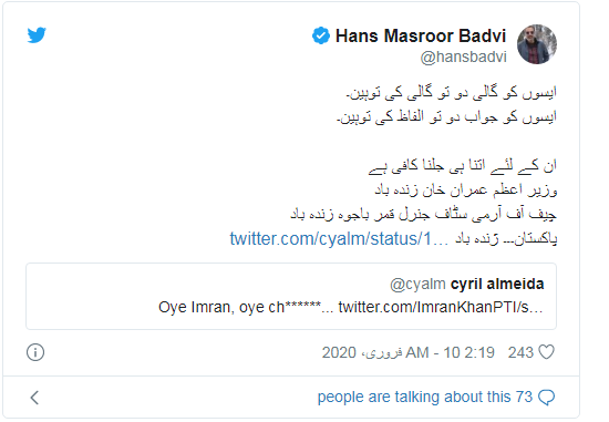 بلاگر مسرور بدوی نے سرل المیڈا کو مخاطب کرتے ہوئے کہا کہ’’ ایسوں کو گالی دو تو گالی کی توہین۔ ایسوں کو جواب دو تو الفاظ کی توہین۔ ان کے لئے اتنا ہی جلنا کافی ہے وزیر اعظم عمران خان زندہ باد ۔۔چیف آف آرمی سٹاف جنرل قمر باجوہ زندہ باد ۔۔۔پاکستان زندہ باد‘‘۔