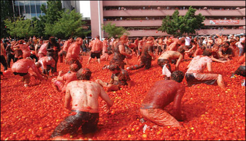 سینٹیاگو…….. چلی میں ٹماٹر مارنے کے سالانہ میلے میں شریک ہزاروں افراد نے سو ٹن ٹماٹر ایک دوسرے کو مار کر خوب موج مستی کی ۔
