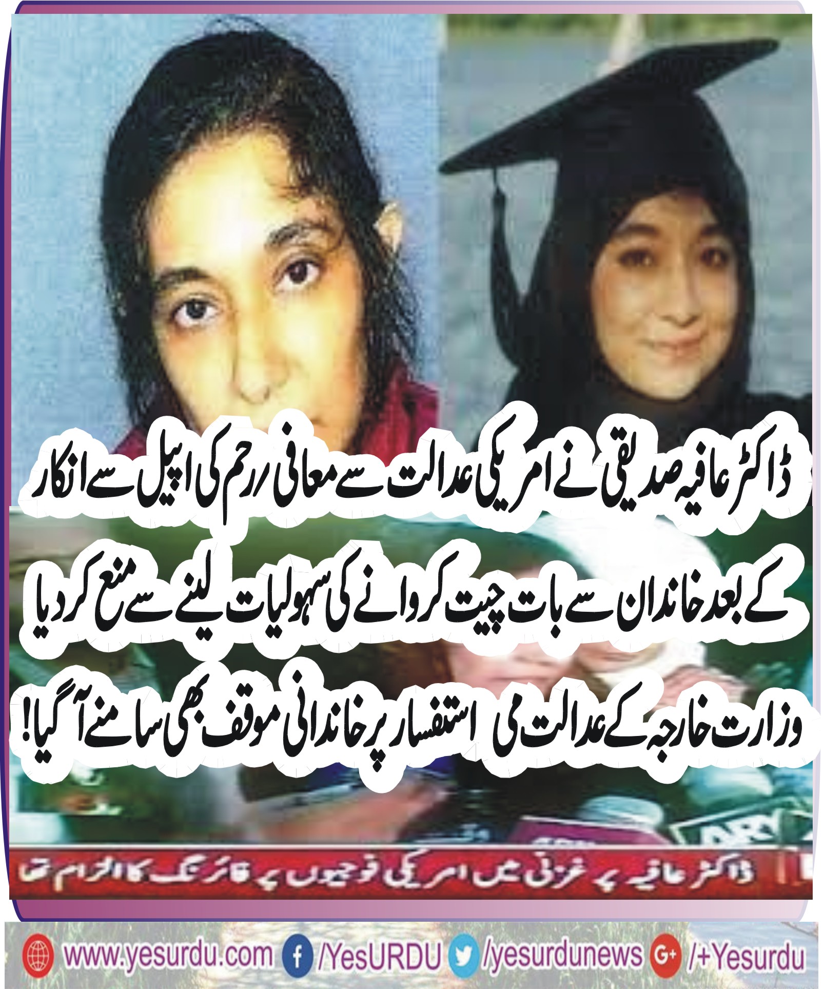 درخواست میں یہ استدعا بھی کی گئی تھی ڈاکٹر عافیہ کی ان کے اہل خانہ سے ویڈیو کال پر بات کرائی جائے اور ان کی صحت سے متعلق رپورٹ عدالت میں پیش کی جائے۔