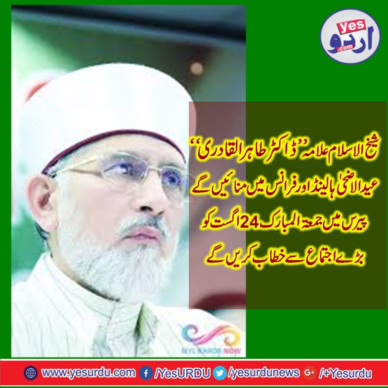 پیرس (نمایندہ خصوصی) شیخ القرآن علامہ ڈاکٹر طاہر القادری اس مرتبہ عیدالاضحیٰ کے موقع پر یورپ کے مختلف ملکوں کے دورے پر ہیں۔ دورے کے دوران وہ ہالینڈ میں ہوں گے جہاں سے عید کے دن وہ فرانس تشریف لاییں گے۔