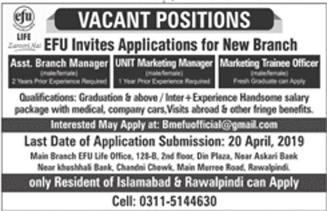 EFU Life Insurance (Islamabad) Jobs 2019 for Asst Branch Manager, Marketing Manager and Marketing Trainee Officers3 April, 2019 Post Views - پوسٹ کو دیکھا گیا: 78