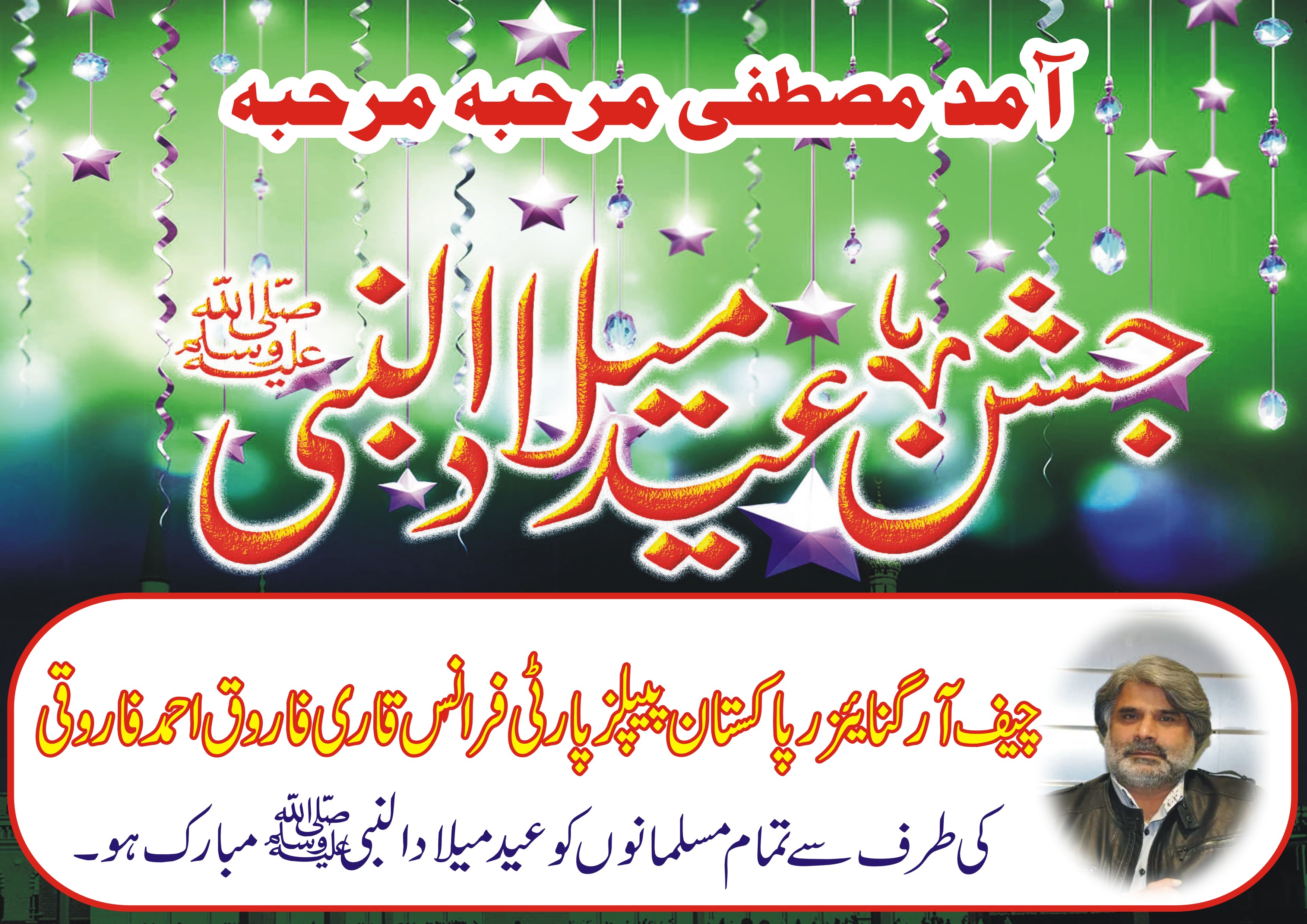 چیف آرگنایئزر پاکستان پیپلز پارٹی فرانس قاری فاروق احمد فاروقی کی طرف سے تمام مسلمانوں کو عیدمیلاد النبی صلی اللہ علیہ وآلہ وسلم مبارک ہو۔
