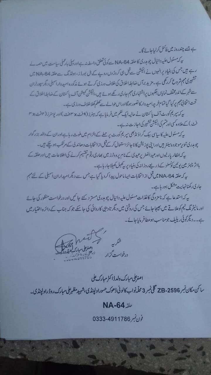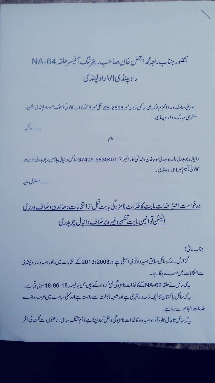 حلقہ این اے 62 راولپنڈی میں قبل از انتخابات دھاندلی و قوانین کی خلاف ورزیاں، امیدوار قومی اسمبلی اصغر علی مبارک کی مخالف امیدوار دانیال چودھری کے خلاف انتخابی غداری دائر سماعت کیلئے منظور