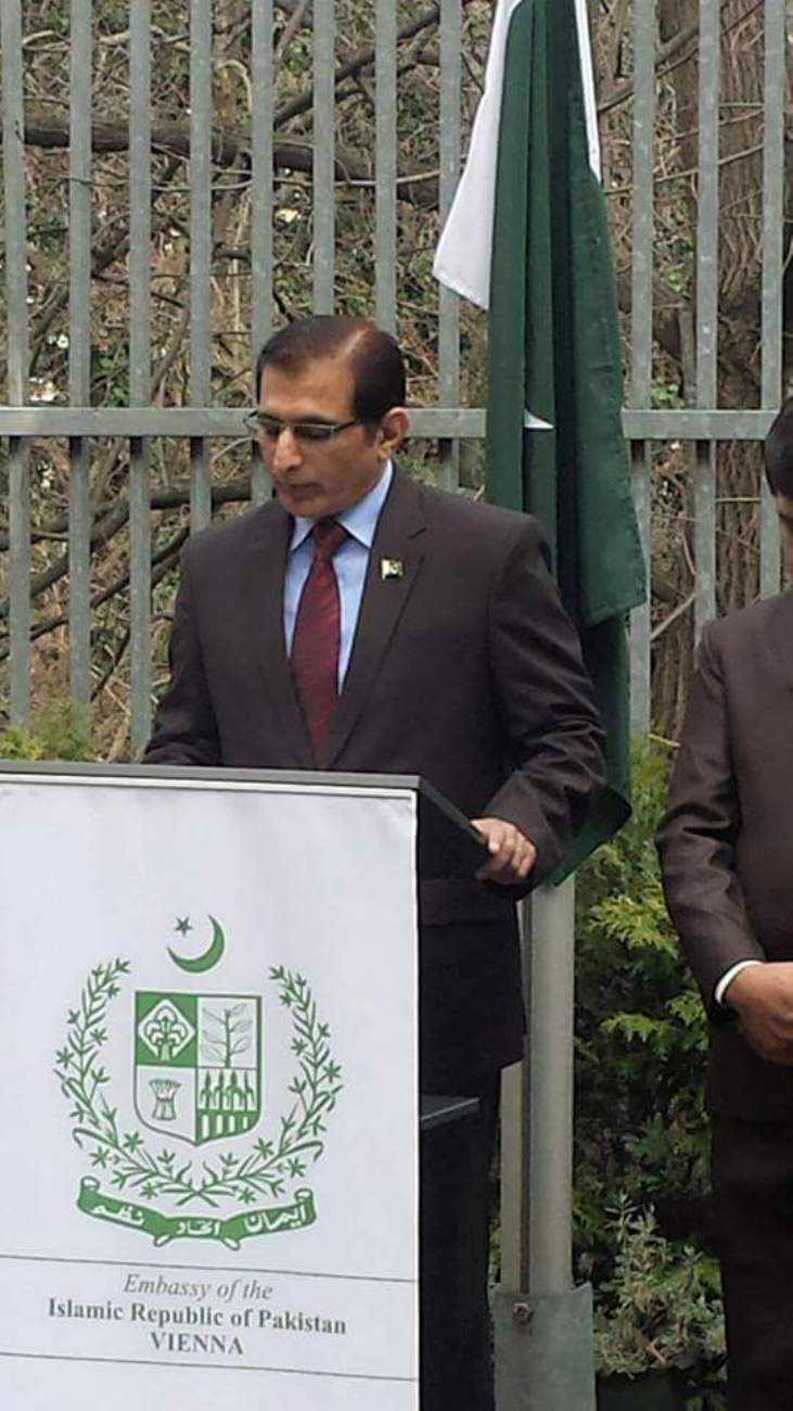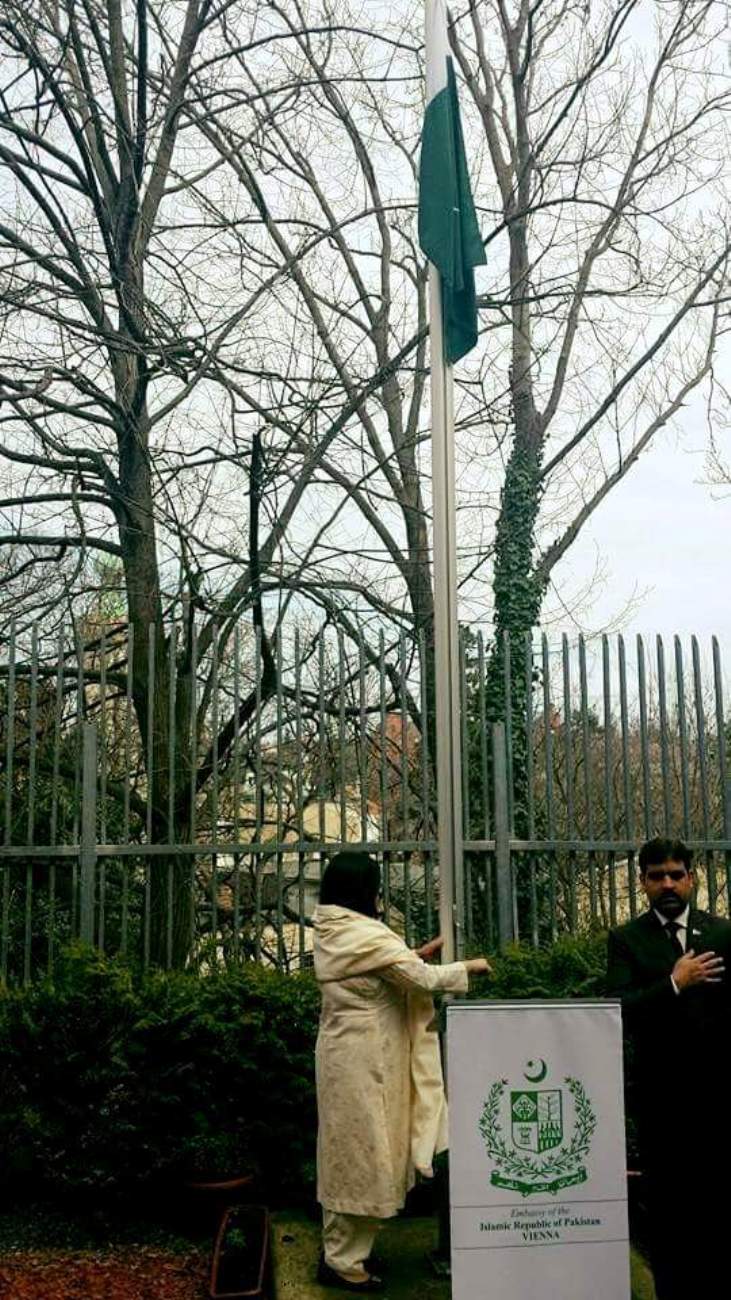 ویانا (اکرم باجوہ) پاکستان سفارت خانہ ویانا میں یوم پاکستان کے موقع پر 23 مارچ کی صبح 10 بجے سفیر پاکستان محترمہ عائشہ ریاض کی زیر قیادت ایک پروقار تقریب کا انعقاد کیا گیا جس میں پاکستانی کمیونٹی نے کثیر تعداد میں شرکت کرکے پاکستان کے ساتھ اپنی اپنی محبت کا اظہار کیا۔