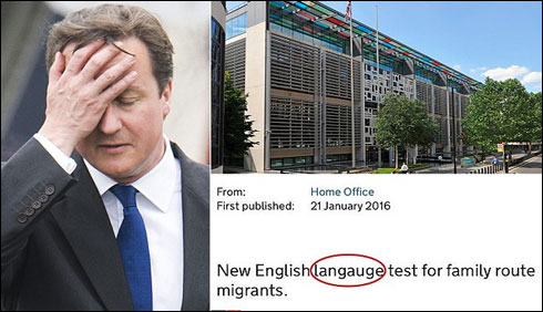 برطانوی وزیر اعظم ڈیوڈ کیمرون کی جانب سے تارکینِ وطن کے لئے لازمی قرار دئیے جانیوالے ٹیسٹ میں وزارتِ داخلہ نے اپنی آفیشل ویب سائٹ پر لفظ زبان ہی کی غلط اسپیلنگLangauge’ لکھی دی جس سے پڑھنے والے عجیب کشمکش میں مبتلا ہو گئے کہ انگریزی بولنے کا تقاضا کرنیوالی حکومت میں ہی الفاظ کے درست ہجے استعمال کرنے کا شعو ر نہیں ہے ۔برطانوی انگریزی زبان پردنیا میں سب سے زیادہ اورمکمل عبور رکھنے والی قوم کے بھی دعویدار رہے ہیں تاہم ایک انتہائی غیر معمولی اور حیرت انگیر پہلو یہ ہے کہ برطانوی وزارتِ داخلہ نے اپنی آفیشل ویب سائٹ پر لینگوئج کےہجے ہی غلط لکھ دیئے۔واضح رہے کہ برطانوی حکومت نے ٹیسٹ میں ناکامی کی صورت میں تارکین وطن کی برطانیہ سے بے دخلی کی تصدیق کی تھی۔ چند روز قبل کیمرون نے نئی پالیسی کا اعلان کرتے ہوئے بتایا کہ تقریباً ڈھائی سال سے برطانیہ میں مقیم تمام تارکین وطن خواتین کیلئے یہ ٹیسٹ دینا ضروری ہو گا۔انہوں نے نہایت واضح الفاظ میں کہا تھا کہ اگر آپ اپنی انگریزی زبان بہتر نہیں بناتے تو آپ کے یہاں رہنے کی کوئی ضمانت نہیں ہو گی۔