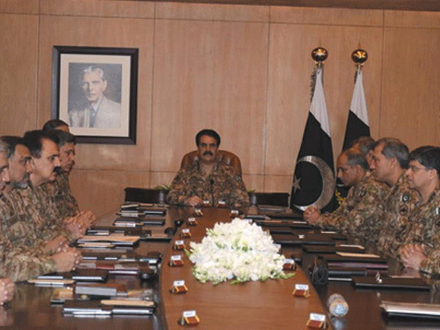 راولپنڈی: آرمی چیف کی زیر صدارت کور کمانڈرز کانفرنس ہوئی جس میں جنرل راحیل شریف کی خدمات پر زبردست خراج تحسین پیش کیا گیا۔