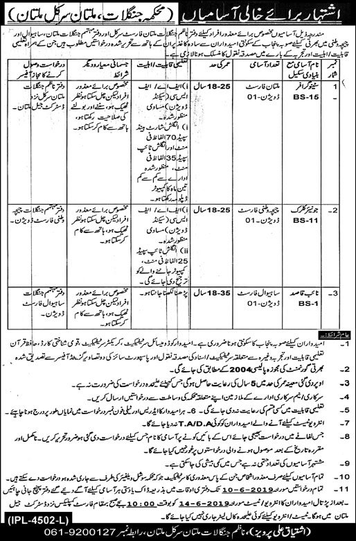 Forest Department Punjab Jobs 2019 for Stenographer, Junior Clerk and Naib Qasid (Multan Circle)