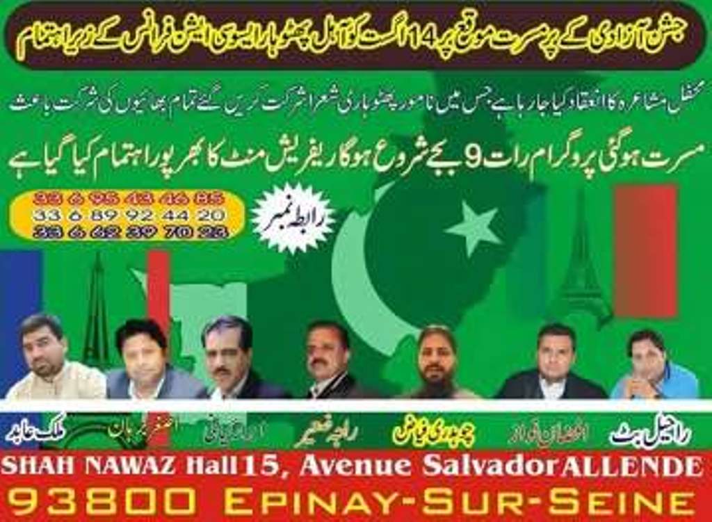 فرانس (ثاقب محمود) جشن آزادی کے پرمسرت موقع پر 14 اگست کو آہل پھٹو ہار ایسوسی ایشن فرانس کے زیراہتمام محفل مشاعرہ کا انعقاد کیا جا رہا ہے جس میں نامور پھٹو ہاری شعرا شرکت کریں گے تمام بھائیوں کی شرکت باعث مسرت ہو گی پروگرام 9 بجے شروع ہو گا۔
