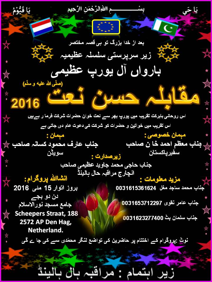 ہالینڈ : مقابلہ حسن نعت 2016 کا اشتہار، یورپ بھر سے نعت خواں حضرات شرکت فرما رہے ہیں۔Holland Naat Competition Post Views - پوسٹ کو دیکھا گیا: 520
