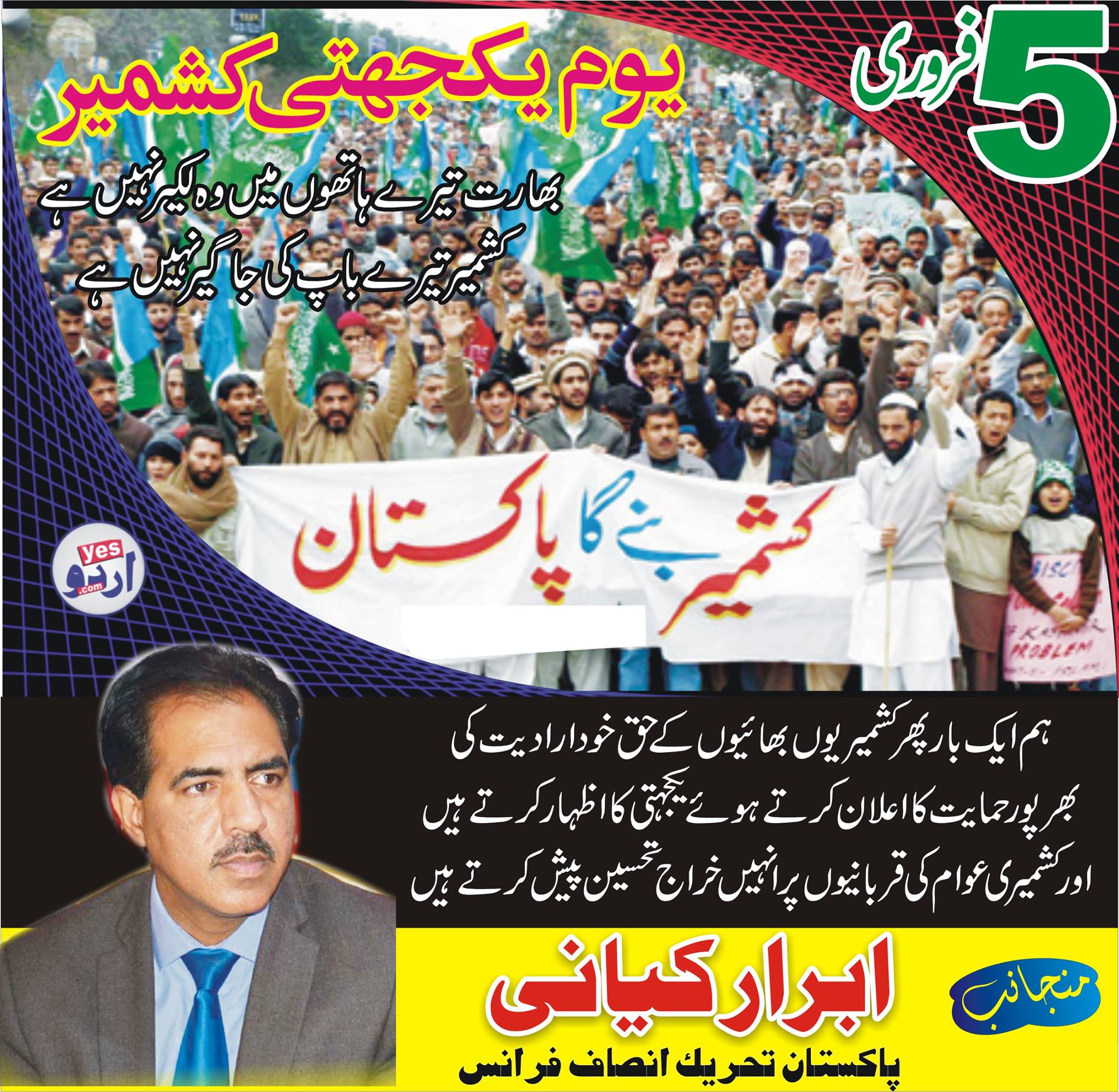 ابرار کیانی پاکستان تحریک انصاف فرانس کی طرف سے 5 فروری کشمیر ڈے یوم یکجہتی کا اشتہار