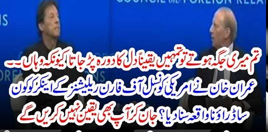 جس میں مذاکرات چل رہے ہیں ہم امریکہ اور افغانستان کو قریب لانے کی کوشش میں مصروف ہیں اب دوسری طرف ایران ہے ہمارے تو وہاں سعودی عرب اور امریکہ کا تنازعہ شروع ہو چکا ہے ایسی صورت حال میں ہمارے تیسری طرف موجود بھارت ہمیں جس طرح دھمکانے کی کوشش کر رہا ہے ایسی صورت حال میں ہم پر بہت پریشر ہے اگر آپ میری جگہ ہوتے تو کیا کرتے ، انہوں نے اینکر کانام لیتے ہوئے کہا کہ رچرڈ تمہیں تو دل کا دورہ پڑ جاتا اگر تم میری جگہ ہوتے ، جس پر کانفرنس میں موجود تمام شرکاء نے قہقہہ لگا دیا ، واضح رہے کہ وزیر اعظم عمران خان نے کہاہے کہ اسلام صرف ایک ہے ، انتہا پسند اوراعتدال پسند اسلام کی اصطلاحوں کومسترد کرتا ہوں، پاکستان کا امریکہ کی دہشت گردی کے خلاف جنگ کاحصہ بننا تاریخ کی سب سے بڑی غلطی تھی ، نائن الیون کے بعد امریکہ نے اچانک مجاہدین کو دہشت گرد کہنا شروع کردیا ۔نیویارک میں امریکی تھنک ٹینک کونسل آف فارن ریلیشن سے خطاب کرتے ہوئے وزیر اعظم عمران خان نے کہاہے کہ کرکٹ سے میں نے سیکھا کہ کامیابی کیسے حاصل کی جاتی ہے، کھیل مقابلہ کرنا اوربرے حالات کا سامنا کرنا سکھاتے ہیں؟22سال کی جدو جہد کے بعد اس مقام پر پہنچا ہوں، ماضی کی حکومتوں کی ناکامیوں کی وجہ سے آئی ایم ایف کے پاس جاناپڑا ۔انہوں نے کہا کہ گھروں کوچلانے کیلئے خرچ کم اور آمدن بڑھانا ہوتی ہے ، گزشتہ حکومتیں معیشت کی سمت درست کرنے میں ناکام رہیں ، ہم کوخراب معیشت ورثے میں ملی ، حکومت ملی تو کرنٹ اکاﺅنٹ خسارے کا سامنا تھا ،خسارے سے نکلنے کیلئے سعودی عرب ،چائنہ اوردیگر مسلم ملکوں نے مدد کی ،چین نے دیوالیہ ہونے سے بچنے کیلئے پاکستان کی مدد کی، ماضی میں اخراجات کے مقابلے میں آمدن کوبڑھایا نہیں جاسکا ۔