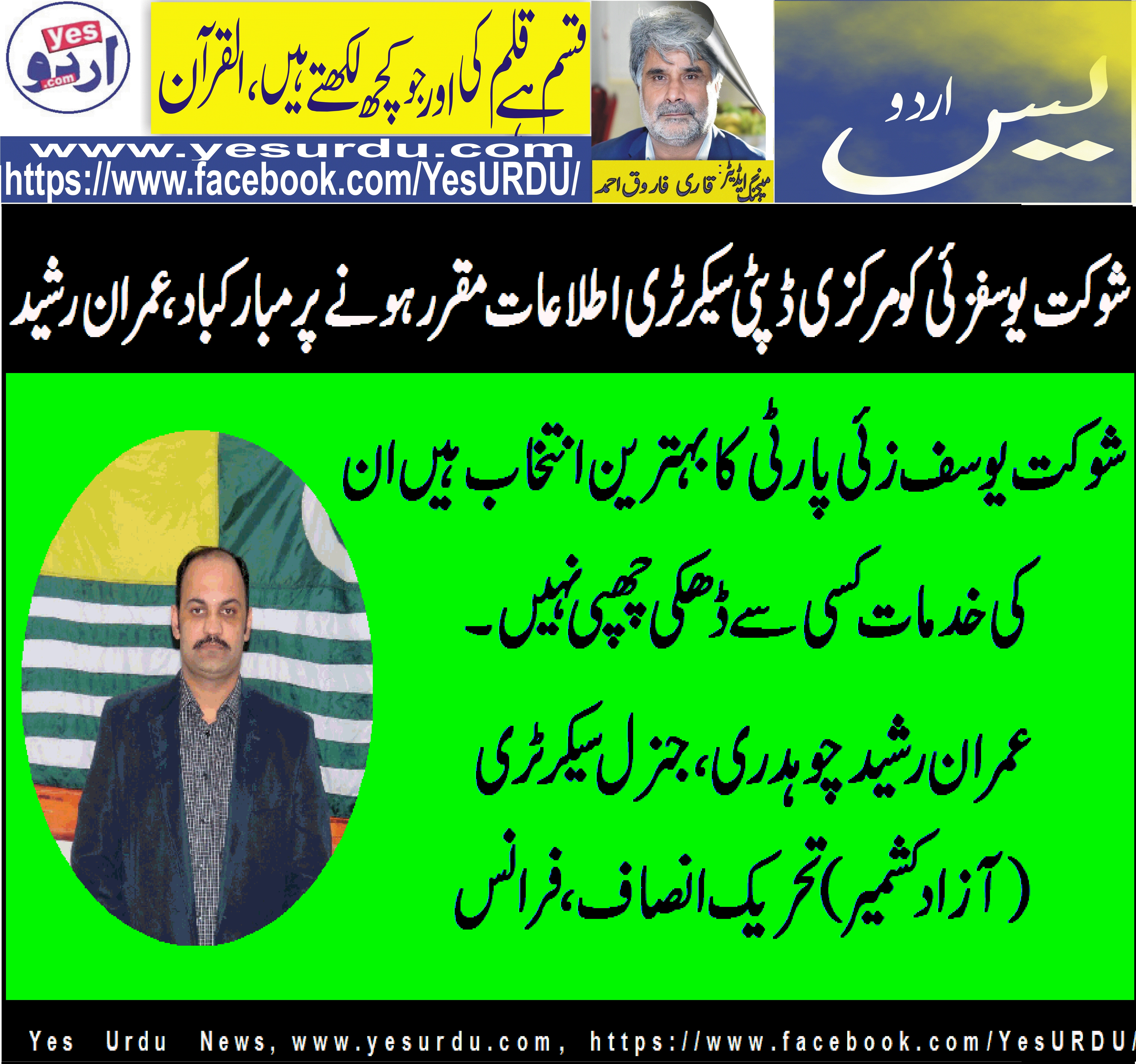 ُیرس (ایس ایم حسنین) آزاد کشمیر تحریک انصاف ،فرانس کے جنرل سیکرٹری عمران رشید چوہدری نے شوکت یوسف زئی پارٹی کا بہترین انتخاب قرار دیا ہے اور انہیں ڈپٹی سیکرٹری اطلاعات مقرر ہونے پر مبارکباد کا پیغام دیا ہے اور اپنے بیان میں کہا ہے کہ ان کی خدمات ۔بے شماور اور کسی سے ڈھکی چھپی ہوئی نہیں ہیں۔