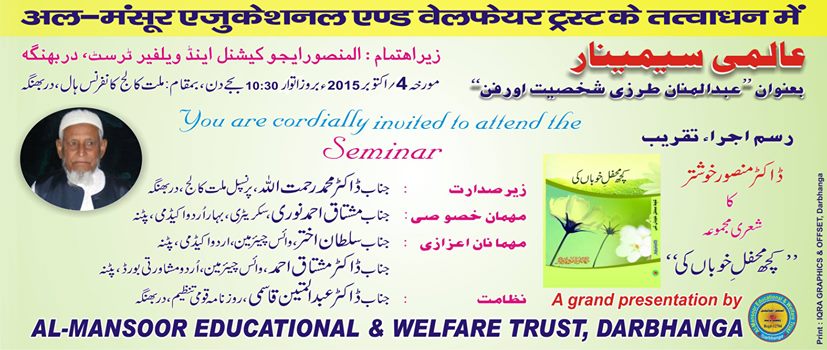 دربھنگہ (کامران غنی) المنصور ایجو کیشنل اینڈویلفیئر ٹرسٹ، دربھنگہ کے زیر اہتمام یک روزہ عالمی سمینار بعنوان ”عبدالمنان طرزی شخصیت اورفن”آئندہ 4 اکتوبر 2015 بروز اتوار، بوقت 10:30بجے دن مقامی ملت کالج ،دربھنگہ کے کانفرنس ہال میں ہو گا۔
