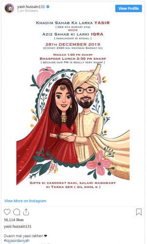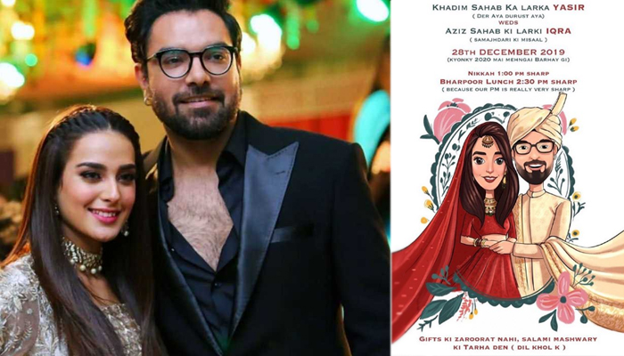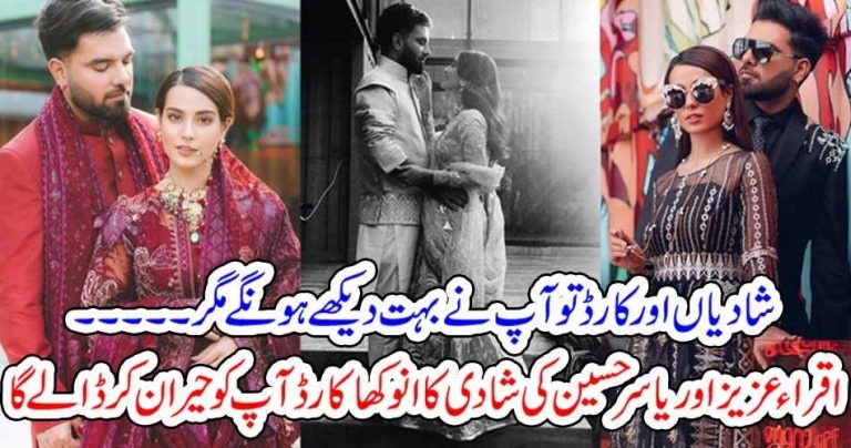 تفصیلات کے مطابق شادی کارڈ خصوصی طور پر اقرار عزیز اور یاسر دونوں کی جانب سے اپنے انسٹاگرام پر شئیر کیا گیا ہے، انسٹاگرام پر پورسٹ جاری کرتے ہوئے کیپشن میں دونوں نے اپنے مداحوں سے انہیں دوعاؤں میں یاد رکھنے کی درخواست کی ہے، ساتھ ہی ساتھ انہوں ہیش تیگ اقراء یاسر دا ویاہ بھی لکھا ہے۔ دونوں اداکاروں کی شادہ کا کارڈ شادی کے عام کارڈوں سے زرا ہٹ کر اور منفرد بھی ہے،سوشل میڈیا پر رواں سال خبروں کی زینت بننے والے اور مقبول ترین جوڑی یاسر حسین اور اقراء عزیز رواں ماہ دسمبر کی 26 تاریخ کو شادی کے بندھن میں بندھ جائیں گے۔ اس کارڈ کی تیاری میں دیکھا جا سکتا ہے کہ ہے یہ مزاحیہ رکھا گیا ہے جبکہ کارڈ کے عین وسط میں عروسی جوڑے میں ملبوس اقرارء اور یاسر کو گرافکس میں دکھایا گیا ہے ۔ جوڑے کی جانب سے تحفے نہیں بلکہ دل کھول کر سلامی دینے کا کہا گیا ہے، خاص طور پر شوبز انڈسٹری سے تعلق رکھنے والے مشہور لوگوں نے اس کا کارڈ پر مبارکباد کے کمنٹس بھی دیئے۔