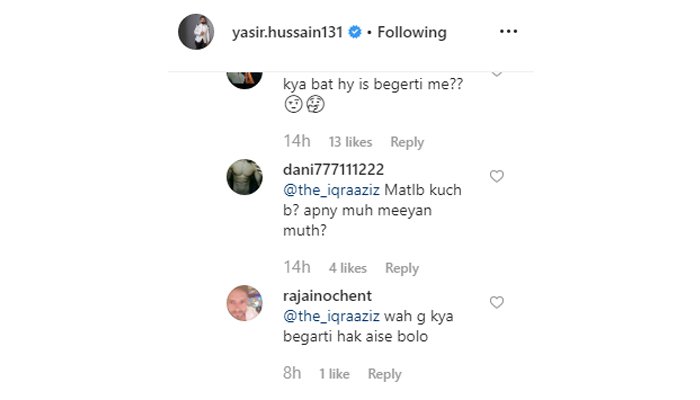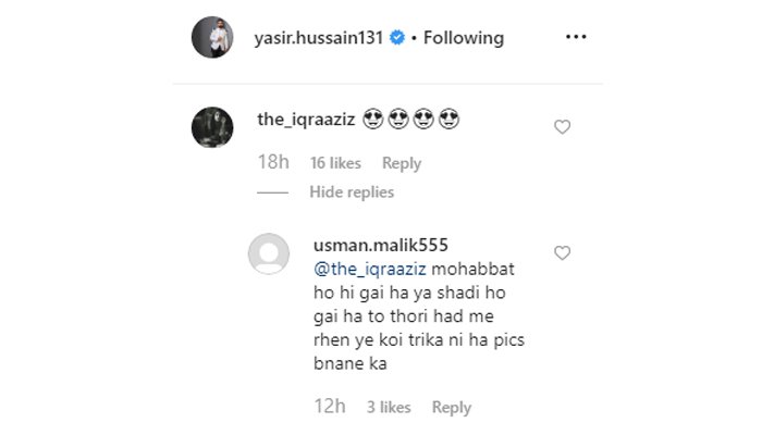 عثمان ملک نامی ایک صارف نے یاسر حسین کی تصویر پر نصیحت کرنے کا انداز اپناتے ہوئے کہا کہ ’محبت ہو ہی گئی ہے یا شادی ہوگئی ہے تو تھوڑی حد میں رہیں یہ کوئی طریقہ نہیں ہے تصویریں لینے کا‘