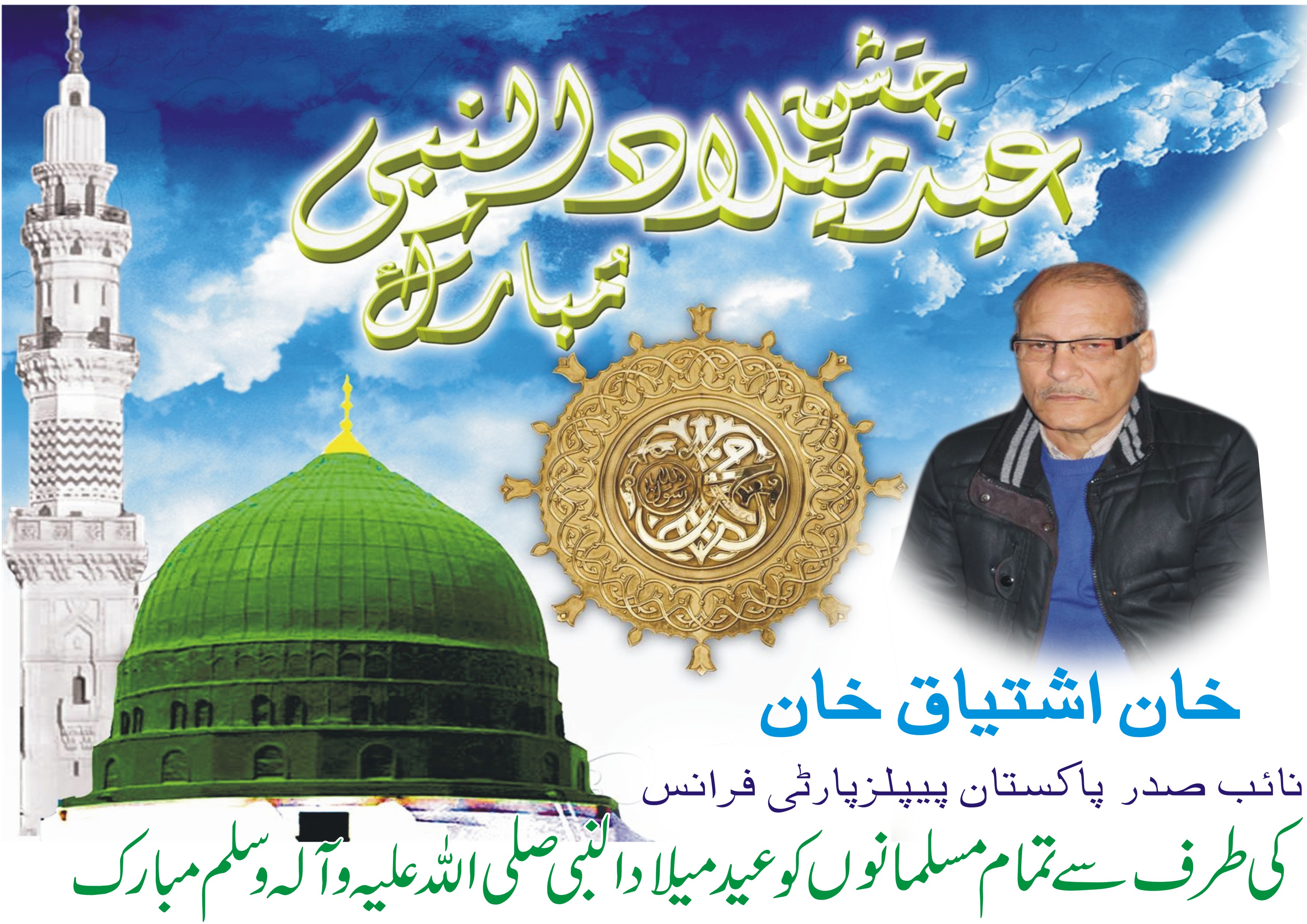 خان اشتیاق خان نائب صدر پاکستان پیپلزپارٹی فرانس کی طرف سے تمام مسلمانوں کو عید میلاد النبی صلی اللہ علیہ وآلہ وسلم مبارک۔