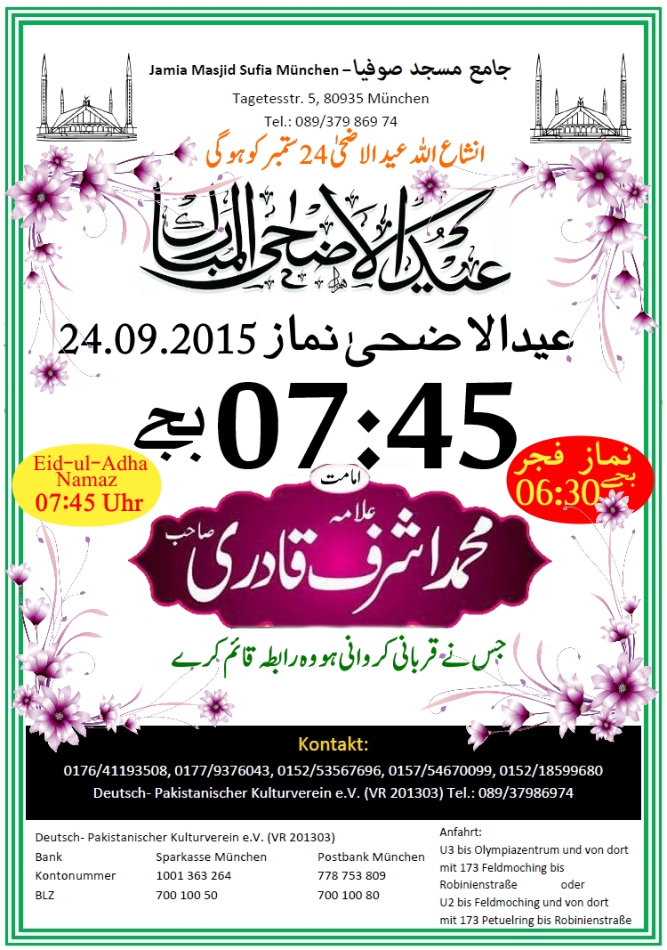 میونخ (محمد خوشال خان) جامع مسجد صوفیا میں عیدالضحیٰ کی نماز 7:45بجے پڑھی جائے گی امامت علامہ محمد اشرف قادری صاحب کریں گے۔
