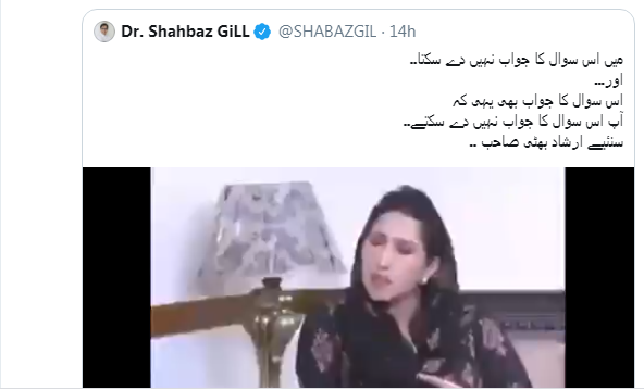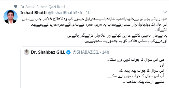 ڈاکٹر شہباز گل کی جانب سے سینئر صحافی ارشاد بھٹی کو مخاطب کیا گیا کہ وہ اس سوال کا جواب بہتر انداز میں دے سکتے ہیں، ڈاکٹر شہباز گل کے مطال بے پر جواب دیتے ہوئے ارشاد بھٹی کا کہنا تھا کہ ’’شہبازبھائی یہی تو ہےجاویدہاشمی، شاہدعباسی،سعدرفیق جیسوں کی وہ لاعلاج غلامی،جس نےانہیں اس حال تک پہنچادیا،نواز،شہبازکےبعداب یہ مریم، حمزہ کےغلام،آگےحمزہ،مریم کےبچےبھی انکےآقا۔۔ یہ بےچارےجیلیں کاٹتے،ماریں کھاتےاور غلامیاں کرتےگذرجاتےہیں اورمزےکی بات،اس غلامی کو یہ جمہوریت سمجھتےہیں‘‘۔