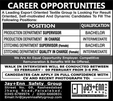 Jay+Enn Textile Company Jobs 2019 for Various Posts / Inter / Bachelor5 February, 2019 Post Views - پوسٹ کو دیکھا گیا: 48