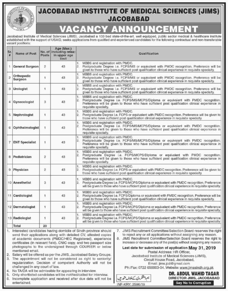 JIMS Institute Jacobabad Jobs 2019 for 20+ Medical & Specialist Posts