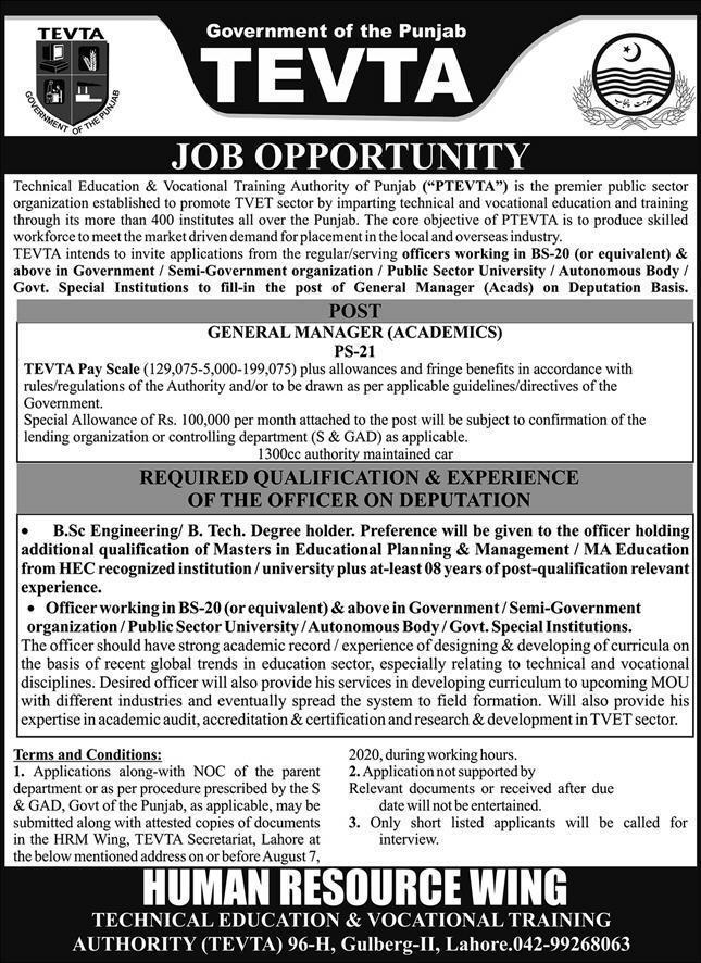 Technical Education And Vocational Training Authority TEVTA has advertised vacancies as mentioned in below advertisement. The ad published in Express.