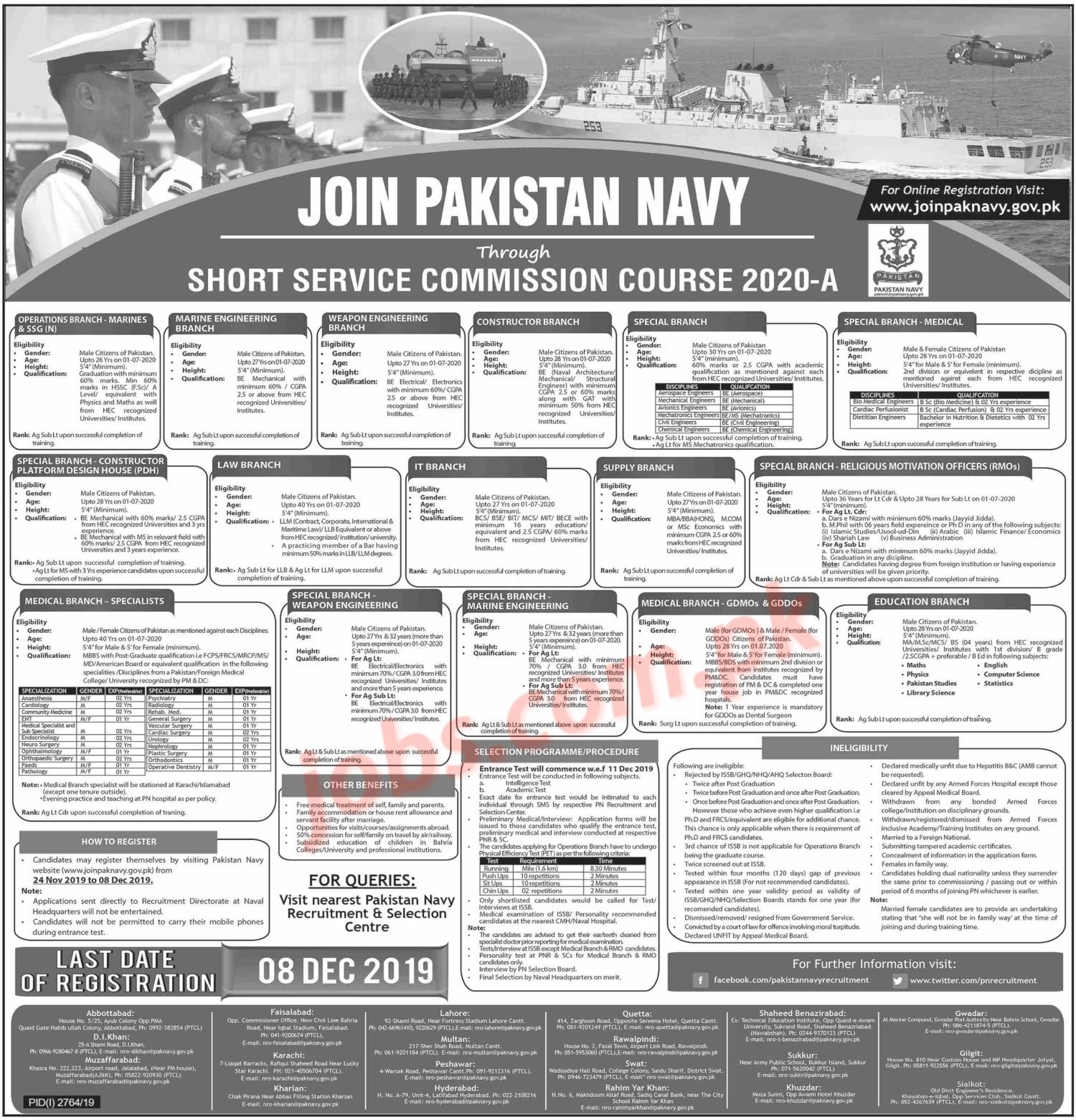 Join Pakistan Navy through Short Service Commission Course 2020-A Posted: 23 Nov 2019 08:43 PM PST Latest Pakistan Navy notification to join Pakistan Navy through Short Service Commission course 2020-A has been announced today. The Pak Navy Short Service Commission Course (SSCC) 2020-A is offered in… Last Date 8th December Post Views – پوسٹ کو دیکھا … Continue reading Join Pakistan Navy through Short Service Commission Course 2020-A
