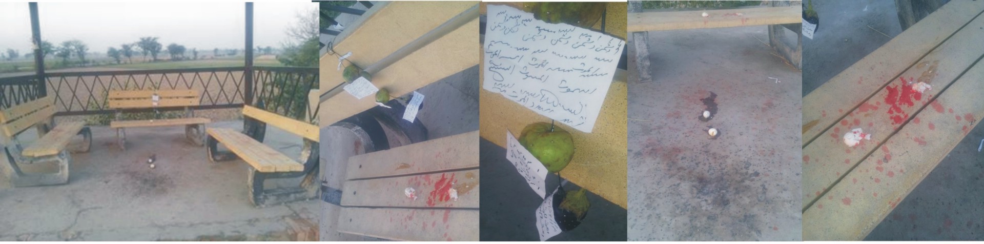 ننکانہ صاحب(محمد قمر عباس) مذاق یا جا دو ٹونہ خوف زدہ شہریوں نے سیر کرنا چھوڑدی ۔ڈی پی او سے تحقیقات کا مطالبہ ۔تفصیلات کے مطابق مانگٹانوالہ بائی پاس پر صبح کے وقت سینکڑوں لوگ سیر کیلے جاتے ہیں جبکہ عمر رسیدہ افراد مسافر خانے کی ان پنچوں پر بیٹھ جاتے ہیں گزشتہ روز سیر کیلے جانے والے صحافیوں قمر عباس و دیگرز نے دیکھا کہ ان بینچوں اور اس کے ار د گرد ٹوٹے ہوئے خون آلود انڈے سوئیاں لگی سبزیاں بینگن اور ٹینڈے ، بکھری ہوئی ماش کی دال جبکہ ڈوری میں پروئے گئے کاغذات جن پر جادوئی عبارات درج تھیں جس کو دیکھ کر تمام لوگ خوف زدہ ہو گے اور درود شریف کا ورد کرنے لگے اس واقعہ کے بعد خوف زدہ شہری اس روڈ پر سیر کرنے سے اجتناب کرنے لگے شہریوں نے ڈی پی او ننکانہ رانا ایاز سلیم سے اپیل کی ہے کہ تحقیقات کر کے ایسے شرارتی عناصر کو گرفتار کیا جائے ۔