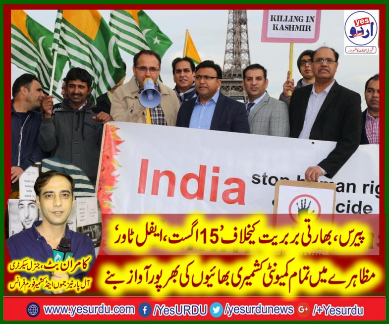 پیرس(نمائندہ خصوصی) کامران بٹ، جنرل سیکرٹری آل پارٹیز جموں اینڈ کشمیر فورم فرانس نے 15 اگست کو بھارت کے یوم آزادی کو یوم سیاہ کے طور پر منانے کا اعلان کرتے ہوئے کہا ہے کہ 15 اگست سہ پہر 03:00 بجے سے شام 05:00 بجے تک پیرس کے مشہور مقام ایفل ٹاور پر کشمیری شہدا کی حمایت اور جدوجہد آزادی کشمیر کی حمایت کیلئے عظیم الشان مظاہرہ کیا جائیگا۔ تمام کشمیری و یورپی کمیونٹی کے افراد اس مظاہرہ میں بھرپور شرکت کو یقینی بنائیں اور اپنے کشمیری بھائیوں کی آواز بنیں۔