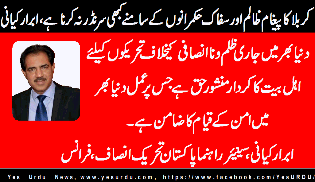 پیرس (ایس ایم حسنین)ابرار کیانی، سینیئر راہنما پاکستان تحریک انصاف ،فرانس نے اپنے ایک بیان میں کہا کہ دنیا بھر میں جاری ظلم و نا انصافی کیخلاف تحریکوں کیلئے اہل بیت کا کردار منشور حق ہے جس پر عمل دنیا بھر میںامن کے قیام کا ضامن ہے ۔ کربلا کا پیغام ظالم اور سفاک حکمرانوں کے سامنے کبھی سرنڈر نہ کرنا ہے