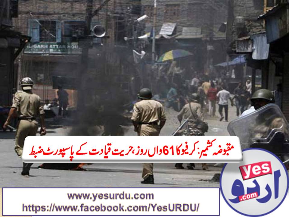 سری نگر: (یس نیوز)مقبوضہ کشمیر میں مسلسل 61 ویں روز بھی کرفیو نافذ ہے جس کی وجہ سے کشیدگی بدستور برقرار ہے جب کہ بھارت نے حریت رہنماؤں کے پاسپورٹ ضبط کرنے کا فیصلہ کیا ہے۔