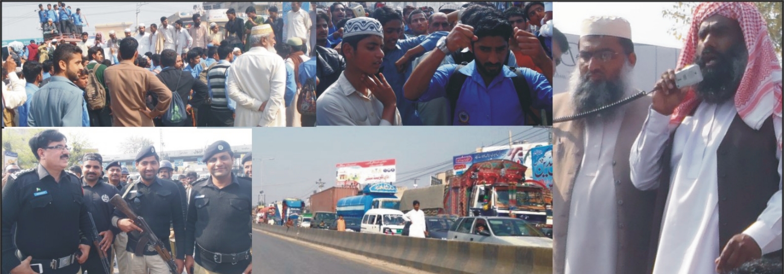 کھاریاں(نیئر صدیقی سے) ممتاز قادری کی پھانسی کے خلاف کھاریاں شہر میں زبردست احتجاج ، مشتعل طلباء اور عوام نے جی ٹی روڈ بلاک کر دی۔ سنی علماء کونسل کی اپیل پر کئے جانے والے احتجاجی مظاہرہ سے خطاب کرتے ہوئے علامہ قاری اختر حسین جلالی، مفتی محمود احمد، مسعود احمد غازی، سید زین العابدین شاہ، مولانا عبدالغفور نقشبندی، قاری لہراسب علی سیالوی ، قاری عبدالغفور جلالی اور دیگر رہنماؤں نے کہا کہ ممتاز قادری کو پھانسی دے کر حکومت نے نبی کریم ﷺ سے غداری کا ثبوت دیا ہے۔غازی علم الدین شہید کو پھانسی دینے والی انگریز حکومت اور نواز حکومت میں کوئی فرق نہیں ۔مظاہرے کے شرکاء مکمل طور پر پرامن رہے اور تھوڑی دیر نعرے بازی کرنے کے بعد درودوسلام پڑھ کر منتشر ہو گئے۔اس موقع پر ڈی ایس پی کھاریاں ملک منظور احمد کی قیادت میں پولیس کی بھاری نفری تعینات رہی