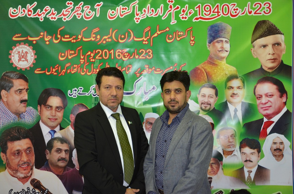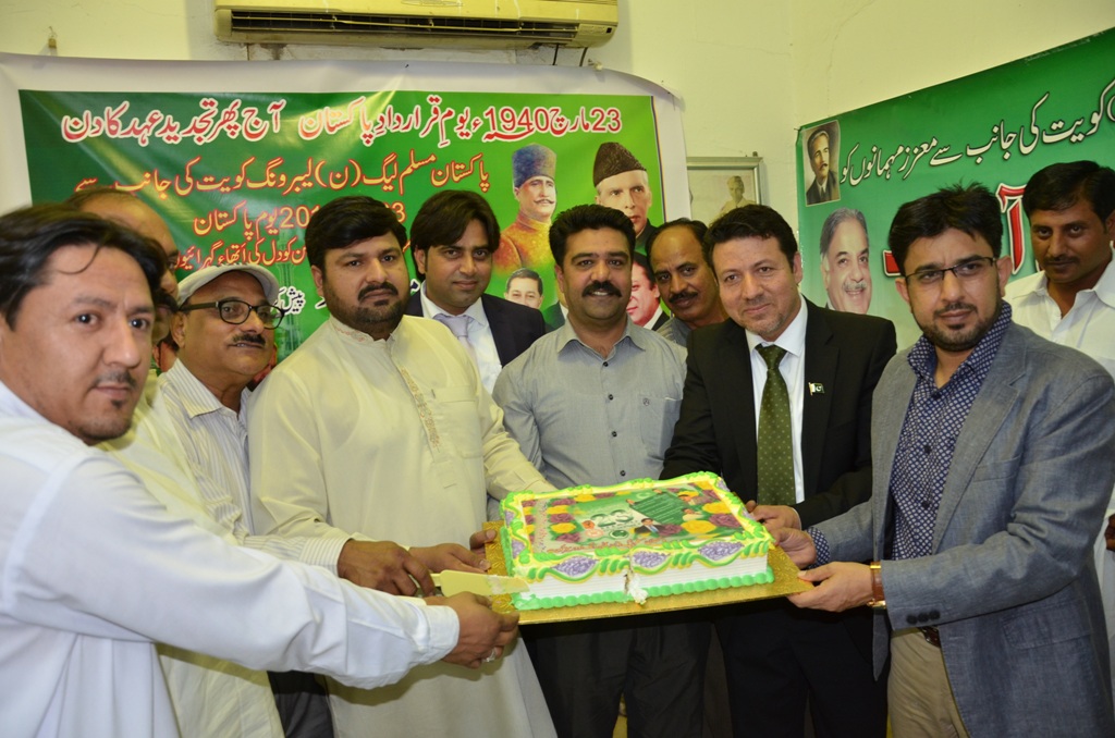 کویت سٹی(نمائندہ خصوصی) PMLN لیبرونگ اوورسیز کویت کے بینر تلے 23مارچ قراردادِپاکستان کی ایک شاندار تقریب لیبر ھاؤس جلیب الشیوخ کویت میں منعقد ہوئی جس کی صدارت تنظیم کے صدر محمد زبیر شرفی نے کی ،اس تقریب میں قراردادِ پاکستان کی خوشی میں کیک کاٹا گیا جو اسپیشل تیارکیا گیاتھا ،یہ تقریب کچھ اس لحاظ سے بھی منفرد تھی اس میں مہمانِ خصوصی ایک نہیں بلکہ مہمانانِ خاص کویت کمیونٹی کی معروف و معتبر شخصیات کی کثیر تعداد موجود تھی۔