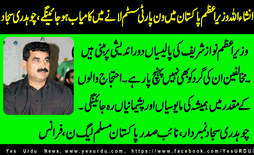 وزیر اعظم نواز شریف کی پالیسیاں دور اندیشی پر مبنی ہیں ۔مخالفین ان کی گرد کو بھی نہیں پہنچ پا رہے ۔ احتجاج والوں کے مقدر میں ہمیشہ کی مایوسیاں اور پشیمانیاں رہ جائینگی۔ چوہدری سجاد نمبر دار، نائب صدر پاکستان مسلم لیگ ن ، فرانس
