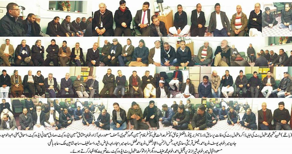 باٹلے (تیمور لون) شہید کشمیر محمد مقبول بٹ کی اہلیہ ذاکرہ مقبول بٹ کی وفات پر سابق لارڈ میئر بریڈ فورڈ غضنفر خالق، کونسلر عدالت علی، کونسلر غلام حسین، محمود کشمیر، آصف مسعود، راجہ مشتاق حسین ایڈووکیٹ، صادق صبحانی ایڈووکیٹ، اسحاق بھٹی، عبدالوحید، جاوید میر، خواجہ یوسف، نوید احمد، فیصل قریشی، حاجی حمید، شمس الرحمنٰ، اعجاز فضل، ماجد میر، سجاد راجہ، فیاض رشید، اسد لطیف، ساجد شاہین ملک، عابد ہاشمی، مسعود اقبال میر، خواجہ شیراز نذیر، شکیل احمد، خواجہ محمد حنیف و دیگر افراد شوکت مقبول بٹ ایڈووکیٹ سے تعزیت کا اظہار کرتے ہوئے۔