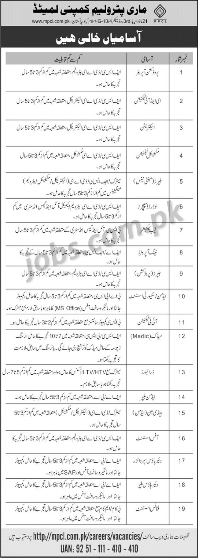 MARI Petroleum Pakistan Government Jobs 2019 for IT, Admin, Finance, DAE, FSc, Office & Support Staff to be filled immediately. Required qualification from a recognized institution and relevant work experience requirement are as following. Eligible candidates are encouraged to apply to the post in prescribed manner. Incomplete and late submissions/applications will not be entertained. Only short listed candidates will be invited for interview and the selection process. No TA/DA will be admissible for Test/Interview. Last date to apply to the post and submit application along with required documents is 27th May 2019.