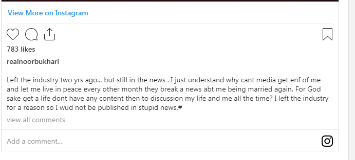 تفصیلات کے مطابق اپنی پانچویں شادی کی خبر پر رد عمل د ینے کے لیے نور بخاری کی جانب سے سماجی رابطوں کی ایپ انسٹا گرام کا سہارا لیا گیا، اپنے بیان میں نور کا کہنا تھا کہ ’’ انہیں شوبز انڈسٹری کو چھوڑے ہوئے دو سال ہوگئے ہیں لیکن آج بھی وہ خبروں میں رہتی ہیں،مجھے سمجھ نہیں آتا کہ میڈیا کیوں میرے پیچھے پڑا ہوا ہے اور کیوں مجھے سکون سے جینے نہیں دیتا۔ہر ماہ یہ میڈیا میری شادی کے حوالے سے خبر بریک کرتا ہے۔ خدا کے لیے اپنے کام سے کام رکھو کیا آپ لوگوں کے پاس میرے اور میری زندگی کے بارے میں بات کرنے کے علاوہ کوئی اور مواد نہیں ہے؟میں نے کسی وجہ سے انڈسٹری سے کنارہ کشی اختیار کی تھی تاکہ مجھے احمقانہ خبروں کی زینت نہ بنایا جائے ‘‘۔
