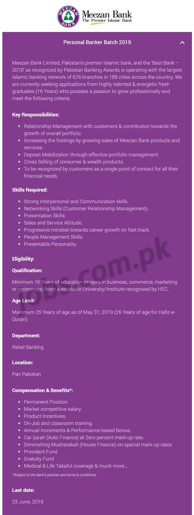 Meezan Bank has announced recruitment for Personal Banker vacancies under Personal Banker Batch 2019 in all major cities across Pakistan. Interested and eligible candidates can now apply online for these posts at www.meezanbank.com. The personal banker position is permanent with market competitive salary, annual increments and performance-based bonus. All selected candidates will be given on-job and classroom training.