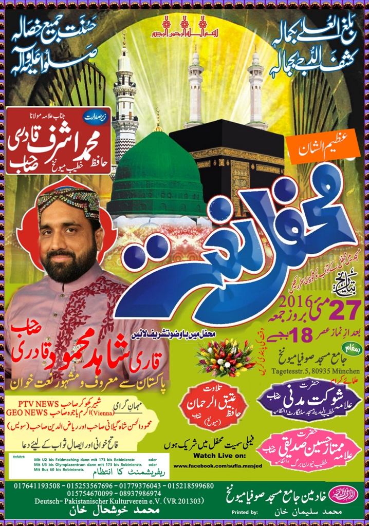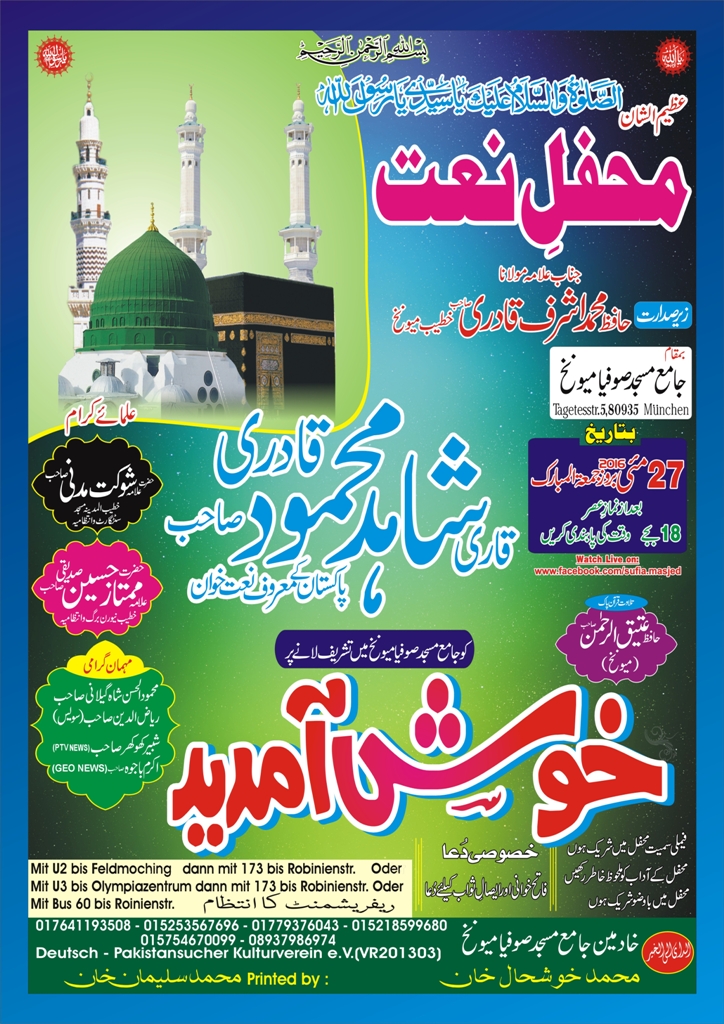 میونخ (نمائندہ خصوصی) جامع مسجد میونخ میں 27 مئی بروز جمعہ المبارک بعد از نماز عصر 6 بجے عظیم الشان محفل نعت کا اہتمام کیا جا رہا ہے جس میں قاری شاہد محمود خصوصی شرکت کریں گے۔