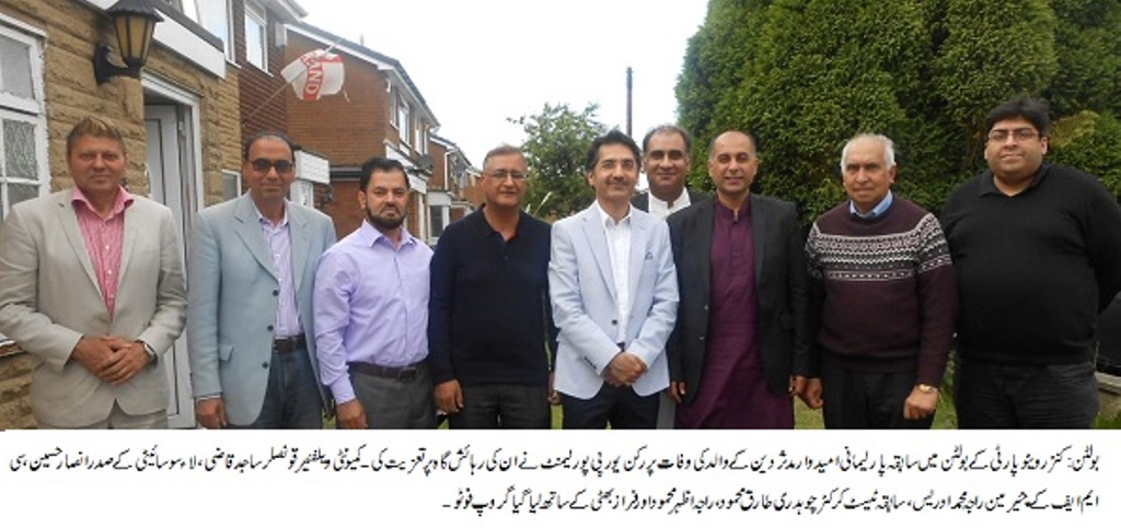 بولٹن: گٹنرویٹو کے پارٹی کے بولٹن میں سابقہ پارلیمانی امیدوار مدثر دین کے والدکی وفات پر رکن یورپی پارلیمنٹ نے ان کی رہائش گاہ پر تعزیت کی، کمیونٹی ویلفئیر قونصلر ساجد قاضی ، لاء سوسائٹی کے صدر انصار حسین ، سی ایم ایف کے چیئرمین راجہ محمد ادریس ، سابقہ ٹیسٹ کرکٹر چوہدری طارق محمود ، راجہ اظہر محمود اور فراز بھٹی کے ساتھ لیا گروپ فوٹو۔
