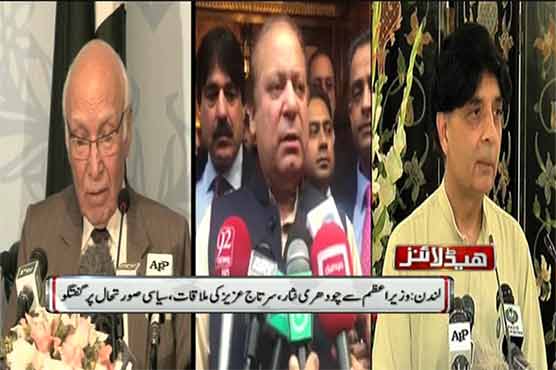 لندن کے چرچل ہوٹل میں وزیر اعظم نواز شریف کی زیرصدارت مسلم لیگ ن کا مشاورتی اجلاس ہوا جس میں وزیر داخلہ چودھری نثار اور مشیر خارجہ سرتاج عزیز نے شرکت کی، وزیر اعظم کا کہنا ہے کہ اب ان کی صحت میں بہتری آ رہی ہے اور وہ جلد پاکستان جائیں گے۔