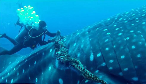 ڈائیورکو زیرآب تیراکی کے دوران وہیل شارک دکھائی دی جس کے جسم کے گِرد مچھلی پکڑنے والے جال کی رسی پھنسی ہوئی تھی۔ڈائیور نے خوفزدہ ہوئے بغیراس وہیل کے قریب جا کر بمشکل رسی کھینچی اور کھول کے ہٹالی دی۔آزاد ہونے کے بعد وہیل نے خوشی سے پانی میں ڈبکیاں لگائیں اور اپنے راستے پر نکل پڑی۔