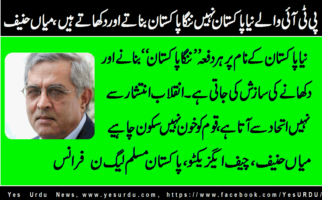 پیرس(ایس ایم حسنین) میاں حنیف ،چیف ایگزیکٹو ،پاکستان مسلم لیگ ن فرانس نے کہا ہے کہ نیا پاکستان کے نام پر ہر دفعہ ”ننگا پاکستان“ بنانے اور دکھانے کی سازش کی جاتی ہے ۔انقلاب انتشار سے نہیںاتحاد سے آتا ہے، قوم کو خون نہیں سکون چاہیے