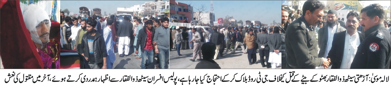 لالہ موسیٰ(جمیل احمدطاہر) غلہ منڈی لالہ موسیٰ کے آڑھتی کے نوجوان بیٹے کو اغواء کے بعدقتل کردیاگیا،نعش بوری میں بندسرائے عالمگیرکے علاقہ سے ملی،ورثاء نے نعش سڑک پررکھ کرجی ٹی روڈ بلاک کردی، اس سلسلہ میں بتایاجاتاہے کہ غلہ منڈی لالہ موسیٰ کے آڑھتی سیٹھ ذوالفقاراحمد گل کا جوانسالہ بیٹامحمدوقاص گزشتہ شام گھرسے نکلا جب کافی دیرواپس نہ آیااور اس کا موبائل فون بھی بندپایاگیاتو والدین کو تشویش ہوئی انہوں نے سٹی پولیس کو بیٹے کی گمشدگی کی اطلاع دے دی ،ساری رات وہ اپنے طورپرتلاش بسیارکرتے رہے ،صبح انہیں پتہ چلاکہ تھانہ سرائے عالمگیرکو کھاریاں پبی سرکارکے علاقے سے لاوارث بوری بندنعش ملی تو ورثاء وہاں پہنچے تو وہ نعش ان کے بیٹے وقاص کی ہی تھی،نعش کو لالہ موسیٰ لاکرورثاء نے جی ٹی روڈ بلاک کردی جو دوگھنٹے تک بلاک رہی بعدازاں پولیس کے ساتھ مذاکرات کے بعدٹریفک کھول دی گئی ۔مقتول محمدوقاص کے قتل کا مقدمہ تھانہ سرائے عالمگیرمیں درج کرلیاگیا،لالہ موسیٰ وسرائے عالمگیرپولیس مصروف تفتیش ہے
