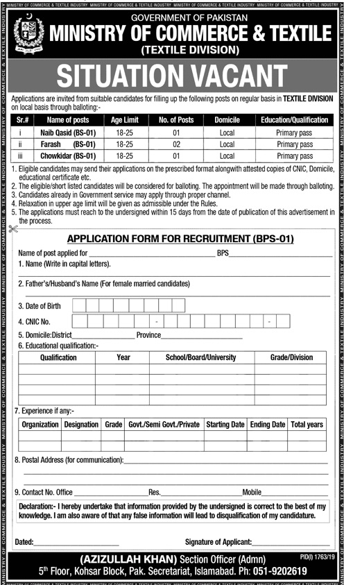 وزارت کامرس وٹیکسٹائل کیلئے آسامیاں خالی ہیں۔