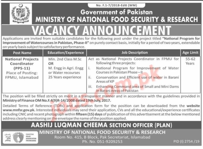 Ministry of National Food Security & Research Jobs 2019 for National Projects Coordinator, Superintendent & Laboratory Assistant