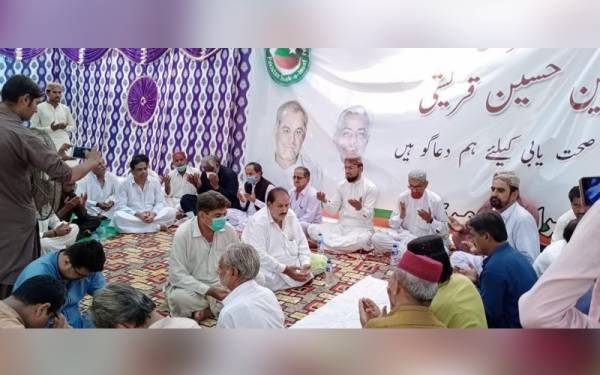 تفصیلات کے مطابق آج عمرکوٹ میں اقلیتی برادری کی جانب سے پاکستان کے وزیر خارجہ اور غوثیہ جماعت کےروحانی سربراہ مخدوم شاہ محمود قریشی ،اور مخدوم زین قریشی کی کورونا مرض سے صحتیابی کےلیے خصوصی پراتھنا کی گی جس میں بڑی تعداد میں مختلف اقلیتی برادری کےلوگوں کےعلاوہ عام شعبہ زندگی سے تعلق رکھنے والے افراد نےشرکت کی ۔ اس موقع پر پاکستان کی سلامتی بقا اور پاکستان سے کورونا مرض کےخاتمے اور مخدوم شاہ محمود قریشی ،مخدوم زین قریشی کی مکمل صحتیابی تندرستی کےلیے خصوصی دعا اور پراتھنا کی گی اس موقع پر پاکستان تحریک انصاف کےمقامی رہنما لیکراج مل مالھی نےکہا کہ ہم نے آج بھگوان سے خصوصی پراتھنا کی ہےکہ مخدوم صاحبان جلد صحتیاب ہوں اس پروگرام میں غوثیہ جماعت کے مریدین کی بھی بڑی تعداد نےشرکت کی آخر میں خیر خیرات بھی کی گی